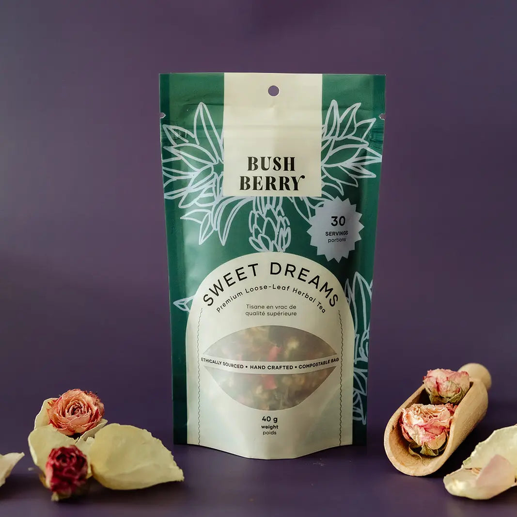 Experience tranquility with Bush Berry Organic Sweet Dreams Loose Leaf Tea. Each sip envelops you in soothing flavors, promoting relaxation and restful sleep. Crafted from natural ingredients, this delightful blend invites you to unwind and recharge your spirit. Embrace the calm—your peaceful nights await!