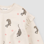 Add a closet staple to your mini-me’s wardrobe with this cotton sweat set. The delicate frills and fun printed panther prints give it an adventurous and playful vibe. Made with pure cotton and elastane French Terry fabric, this girls’ sweatshirt is easy to put on for casual days so she can run, play, and enjoy her day freely.