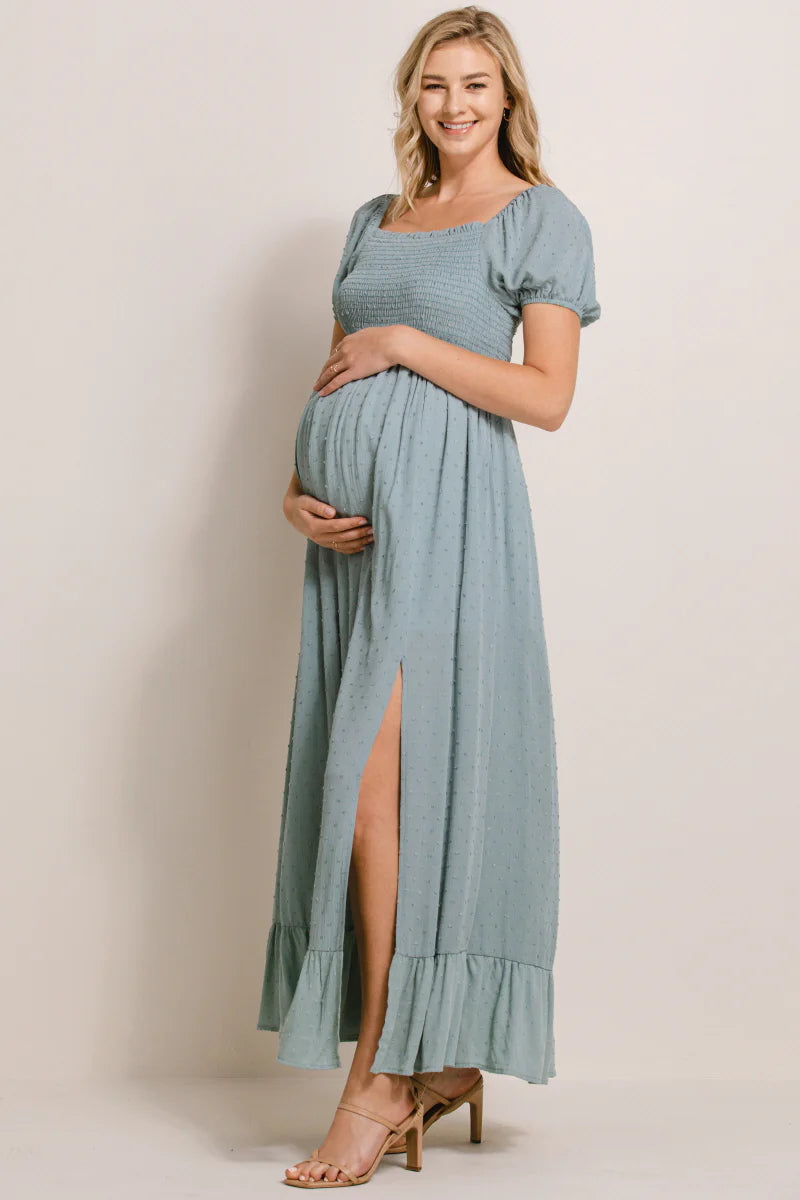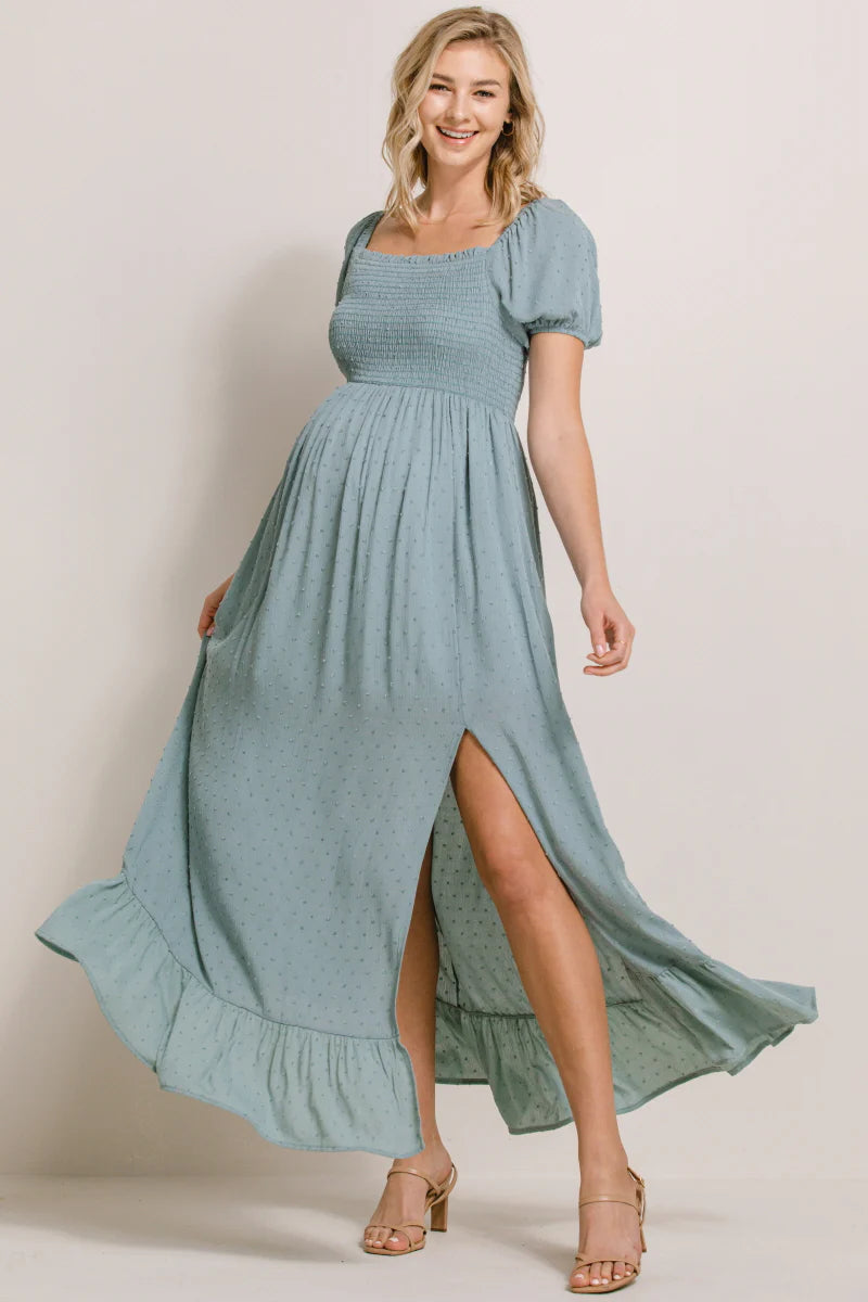 Swiss Dot Smocked Short Sleeve Square Neck Maxi Dress in Sage