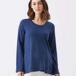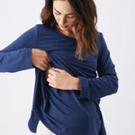 The Hailey Nursing Top is a soft terry back long-sleeve top crafted from a luxurious blend of polyester, viscose, and elastane. Its flattering semi-fitted silhouette features an elegant round neckline that leads to a clever cross-over front for easy nursing access, offering practicality and style. Wear it alone or layered.