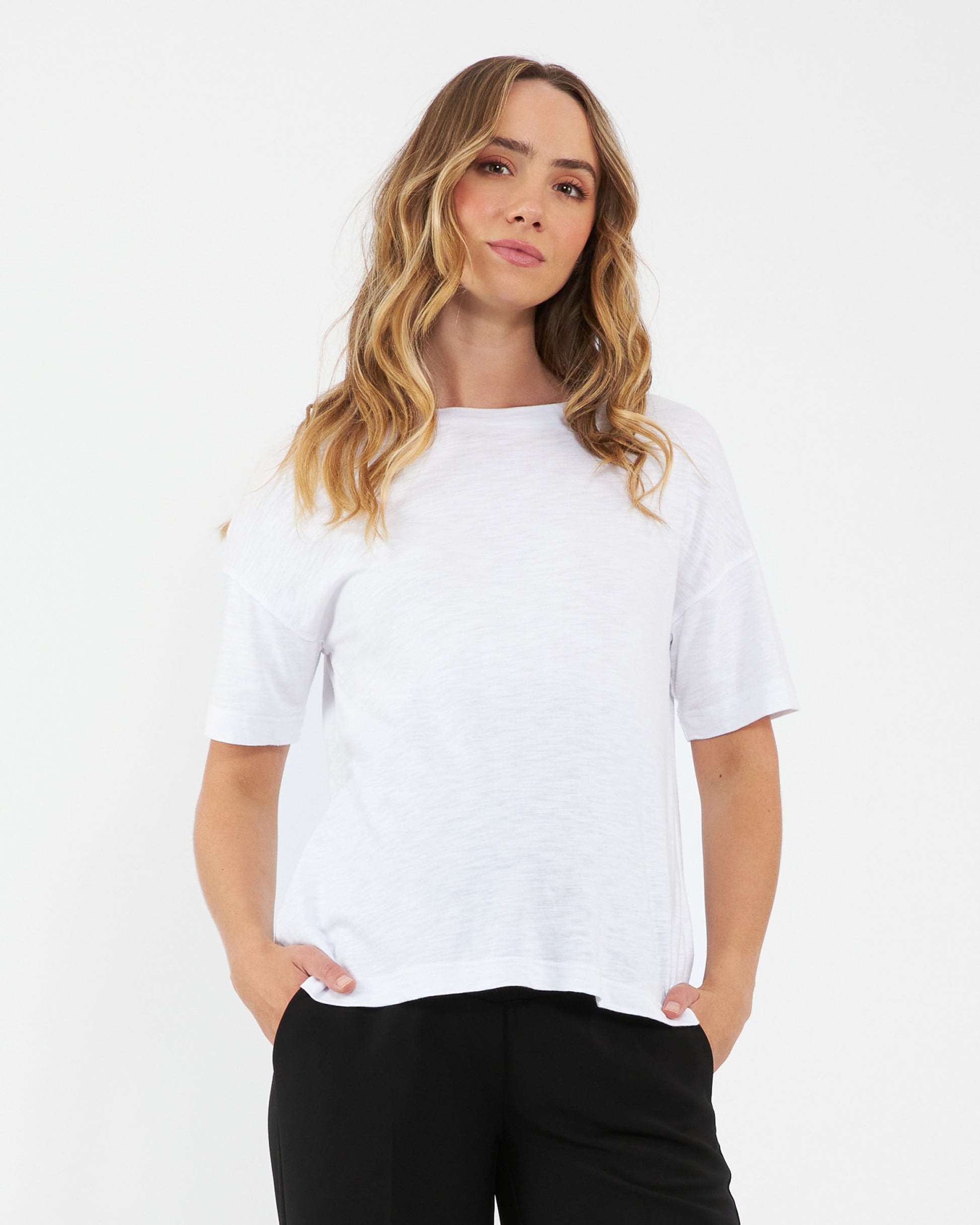 Meet your new favourite tee. It’s the perfect oversized, crew-neck boxy tee before and after pregnancy, and its relaxed fit made from a breathable cotton stretch knit jersey ensures comfort during all three trimesters.